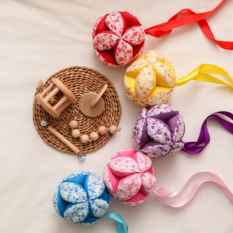1Pc Baby Hand Catching Cloth Ball Toy Infant Interaction Colored Rattle Ball Toy with Ribbon Appease Bed Hanging Rattle Toy Gift
