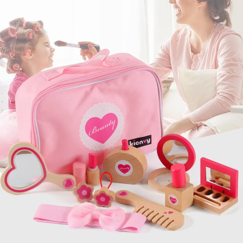 12Pcs 10Pcs Pretend Wooden Makeup Set Simulation Cosmetics Set Pretend Kids Girls Makeup Toys Pink Non-toxic Wood Make up Toys